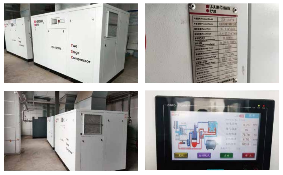 Energy saving mode: EMC (air compressor station contract energy management) Energy-saving models: a 160KW and a 132KW super-first-level energy-efficient two-stage compression permanent magnet frequency converter screw air compressor